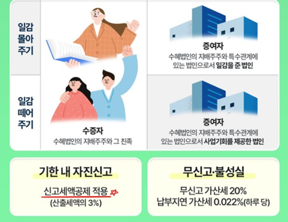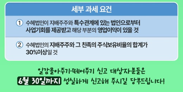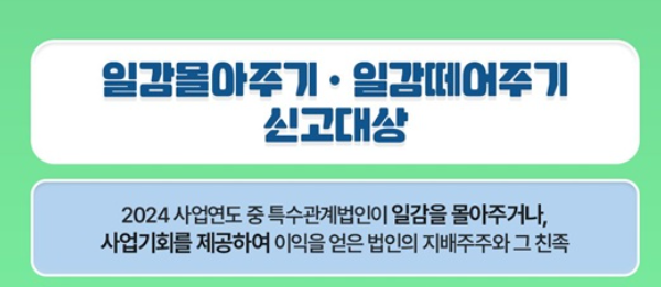2024년 사업연도 중 일감 몰아주기나 떼어주기에 해당하는 구조를 통해 이익을 얻은 법인의 지배주주와 그 친족은 2025년 6월 30일까지 자진 신고 및 납부를 완료해야 합니다.