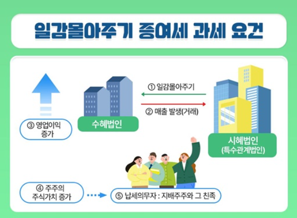 이 세 가지 조건을 모두 만족할 경우, 수혜법인의 지배주주 및 그 친족은 수증자로서 일감 몰아주기로 인한 증여세 납부 의무를 지게 됩니다.