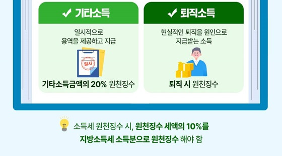 퇴직소득 및 연금소득: 퇴직이나 연금 지급 시에도 해당 소득에 대해 원천징수 후 지급해야 합니다.