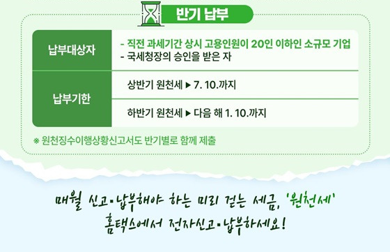 주의사항: 반기 납부자 또한 원천징수이행상황신고서를 납부기한 내에 함께 제출해야 합니다. 만약 신고를 누락하거나 지연될 경우 가산세가 부과될 수 있으므로 주의가 필요합니다.