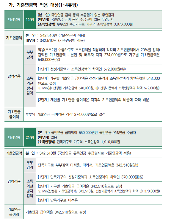 적용 대상은 소득인정액과 기초연금액을 합한 금액이 선정기준액을 초과하는 가구입니다. 2025년 부부가구의 선정기준액은 월 364만 8,000원으로, 소득인정액과 기초연금액의 합이 이를 넘으면 초과분만큼 감액이 이루어집니다.