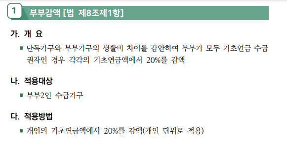 그러나 부부 모두 수급자인 경우, 이 감액 규정이 필수적으로 적용되므로 이를 사전에 인지하는 것이 중요합니다.