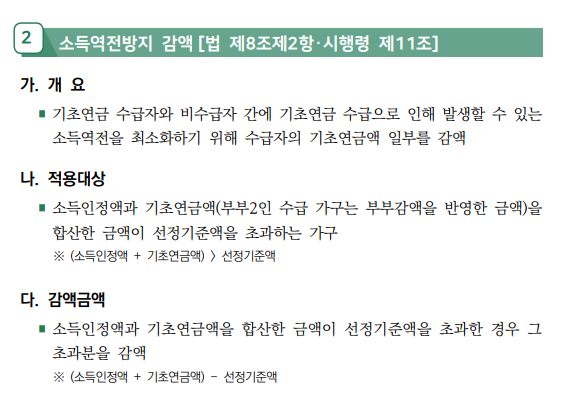 이 제도는 특히 소득인정액이 선정기준액에 근접한 가구에서 큰 영향을 미칩니다. 소득인정액은 근로소득, 연금소득, 재산의 소득 환산액 등을 포함하므로, 부부가구의 재산이나 추가 소득이 많을수록 감액 폭이 커질 가능성이 있습니다.
