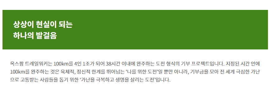 행사의 본질은 순위 경쟁이나 개인 성취에 있지 않습니다. 참가자들은 하나의 팀이 되어 완주를 목표로 협력하고, 그 과정에서 기부를 통한 나눔을 실천하게 됩니다. 이렇듯 옥스팜 트레일워커는 육체적 한계를 넘어선 도전이자, 의미 있는 사회적 기여의 장으로서 큰 가치를 지니고 있습니다.