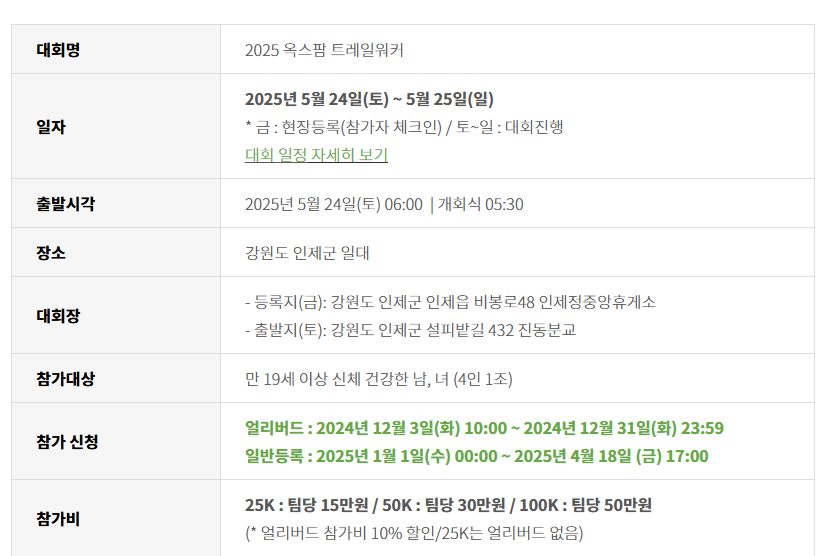 2025 옥스팜 트레일워커는 5월 24일(토)부터 25일(일)까지 양일간 강원도 인제군 일대에서 개최됩니다. 이번 대회는 다양한 거리의 코스를 제공해 참가자들이 자신의 체력과 상황에 맞게 선택할 수 있도록 했습니다.
