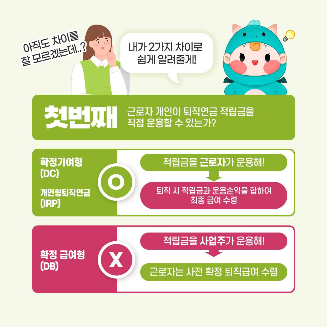 DB형이 기업이 퇴직금 규모를 보장하는 반면, DC형은 기업의 납입액이 확정되고 수익률과 운용 결과에 따라 퇴직금이 달라집니다.