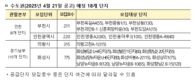 공고 게시: 수도권은 2025년 4월 21일부터, 비수도권은 4월 28일부터 단지별 공고가 LH청약플러스에 게시됩니다.