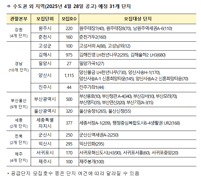 비수도권(4,653가구): 경남 양산물금, 강원 춘천거두, 세종 행정중심복합도시6-4생활권 UR2, 군산신역세권A-2 등 31개 단지입니다. 비수도권은 상대적으로 경쟁률이 낮습니다.