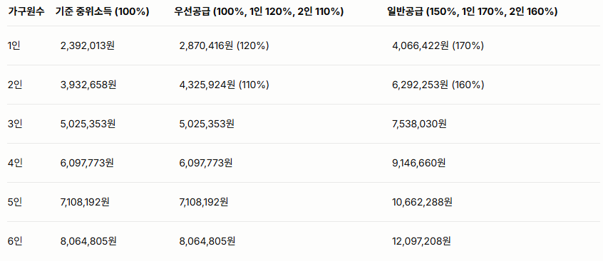 우선공급: 기준 중위소득 100% 이하(1인 가구 120%, 2인 가구 110%)입니다.