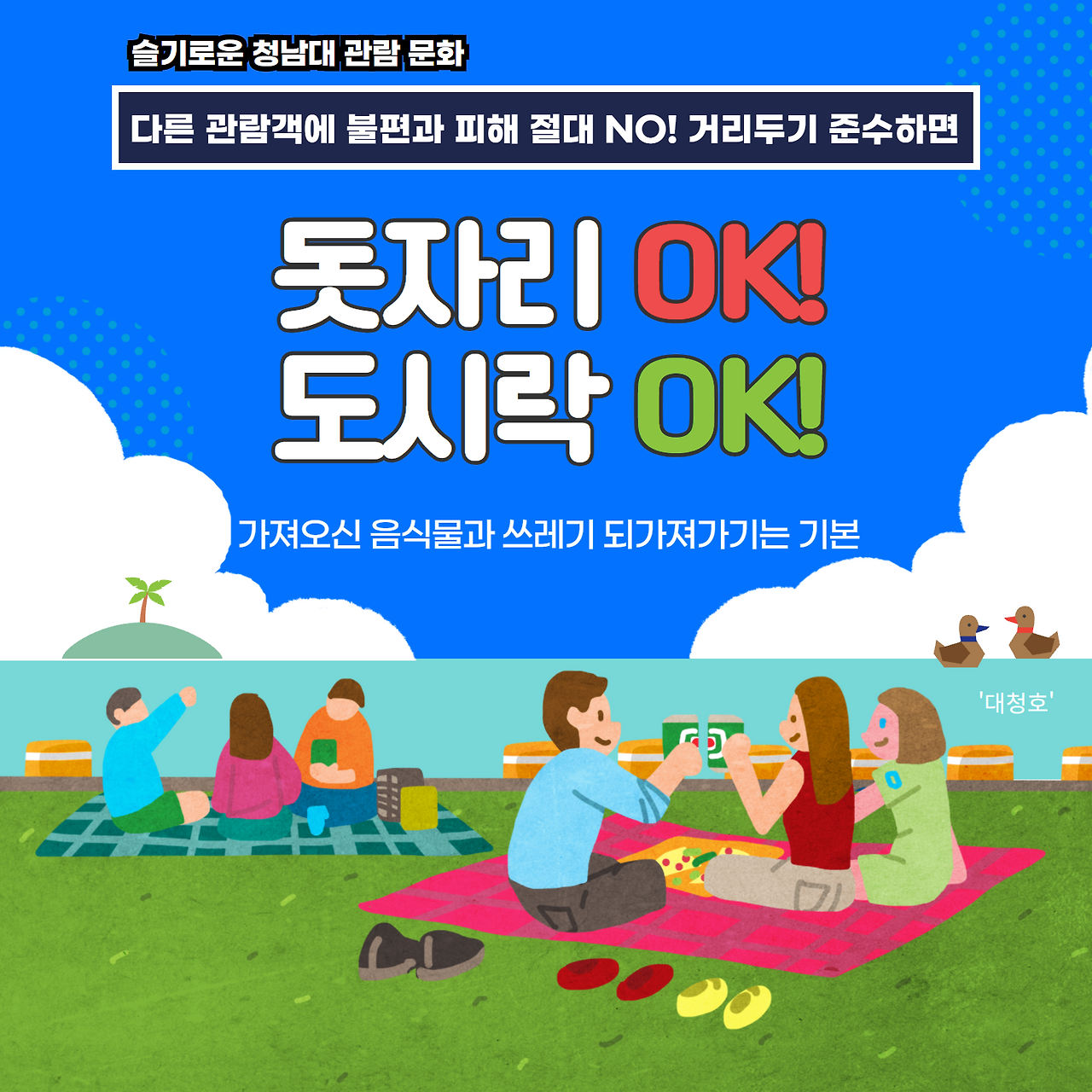 휠체어, 유모차, 보행보조기는 청남대 기념관 맞은편 대여소에서 무료 대여(신분증 필수)됩니다. 재고 부족 시 대여가 제한될 수 있으며, 파손·분실 시 변상, 안전사고는 사용자 책임입니다. 돗자리와 도시락 반입은 가능하나, 거리두기와 쓰레기 반출이 필수입니다. 퀵보드, 인라인, 자전거, 채집망은 반입 금지됩니다.