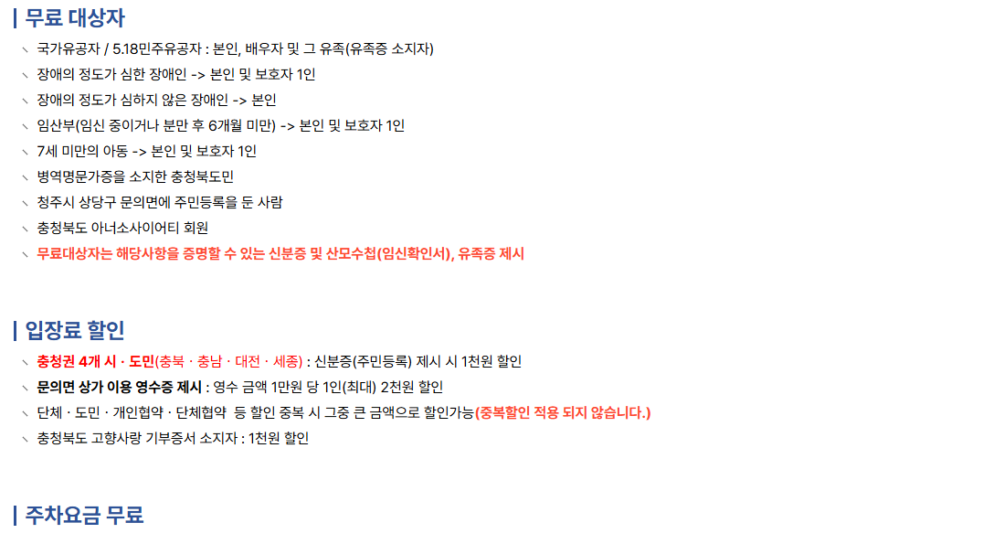 무료 입장 대상은 국가유공자, 5.18 민주유공자(본인, 배우자, 유족), 장애인(심한 장애: 본인 및 보호자 1인, 심하지 않은 장애: 본인), 임산부(분만 후 6개월 미만, 본인 및 동반 1인), 7세 미만 아동(본인 및 보호자 1인), 병역명문가증 소지 충북도민, 청주시 문의면 주민, 충북 아너소사이어티 회원입니다.