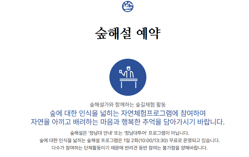 숲해설은 1일 2회(10:00, 13:30) 무료로 운영되며, 유치원, 학교, 일반인, 단체(10~20명)를 대상으로 생태 탐방과 산림치유를 제공합니다. 신청은 청남대 홈페이지 ‘숲해설 예약’ 페이지에서 선착순 접수하며, 오전 10:00 또는 오후 13:30 집결(장소는 예약 확정 문자로 안내)합니다. 운동화와 간편 복장이 필수이며, 반려견 동반은 불가합니다. 문의는 043-220-8774입니다.