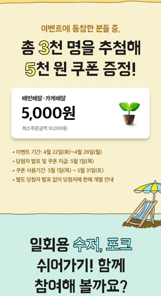 캠페인은 4월 28일까지 운영되며, 참여 고객 중 3,000명을 추첨해 음식 배달 주문 시 사용할 수 있는 5,000원 할인 쿠폰을 제공합니다.