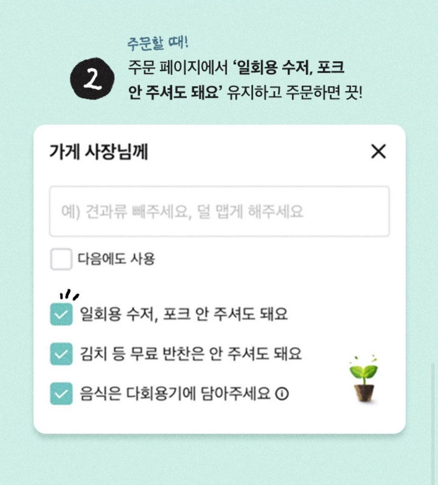 이 기능은 2019년 4월 국내 배달 앱 최초로 도입되었으며, 2021년에는 일회용 수저·포크 안 받기를 기본 옵션으로 설정해 필요 시에만 요청하도록 변경되었습니다.