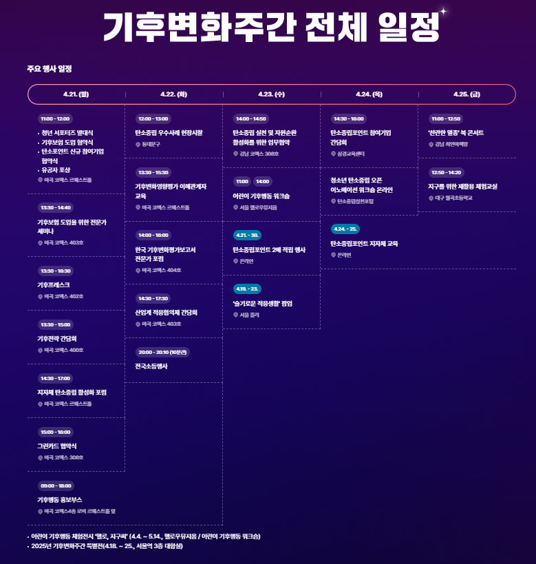 환경부는 4월 21일부터 25일까지 ‘2025년 기후변화주간’을 운영합니다. 이 기간 동안 전국에서 다양한 환경 교육, 전시, 체험 행사가 열립니다. 주요 프로그램은 다음과 같습니다.