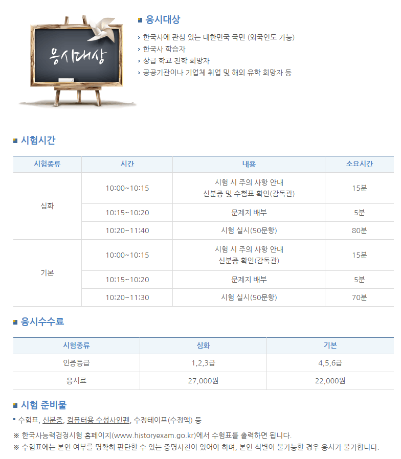 시험은 객관식 50문항으로 구성되며, 총 100점 만점입니다. 심화 과정은 공무원 시험, 공기업 채용, 군 장교·부사관 지원 등에서 주로 요구되며, 기본 과정은 초·중급 수준의 한국사 이해도를 확인하는 데 적합합니다.