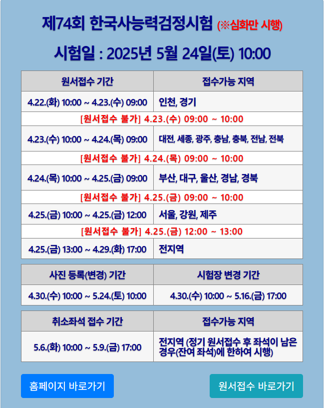 제74회: 2025년 5월 24일(토), 심화만 시행, 정기 접수 4월 22일-4월 29일