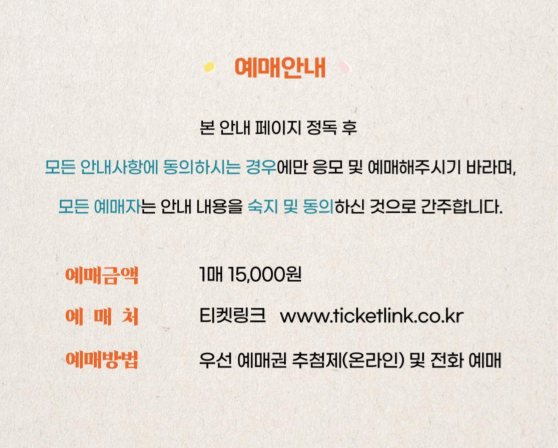 예매는 티켓링크를 통해 이루어지며, 당첨자에게는 개별적으로 문자로 안내됩니다. 단, 당첨되었다고 하더라도 결제 기한 내에 좌석과 회차를 지정하지 않으면 예매가 무효 처리되므로 반드시 기간 내 결제를 완료해야 합니다.