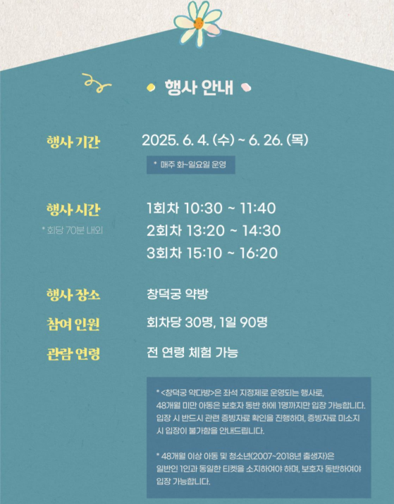 다만, 프로그램 특성상 운영 기간과 회차가 제한적이며, 예매권 추첨제를 통해 참여가 이루어지기 때문에 미리 일정을 확인하고 응모해야 합니다. 매년 높은 경쟁률을 보이는 인기 행사인 만큼, 관심이 있다면 추첨 일정과 예매일정을 꼼꼼히 챙겨두시길 바랍니다. 창덕궁의 자연과 전통 속에서 진정한 치유의 시간을 보내고 싶은 분들에게, 창덕궁 약다방은 더할 나위 없이 훌륭한 선택이 될 것입니다.