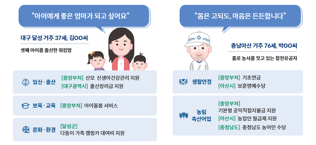 - 저소득층 생활지원금, 기초연금, 장애인연금, 아동수당, 영유아 보육료 지원