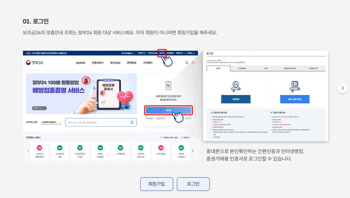 로그인 및 본인인증: 회원가입 후 로그인하고, 공동인증서나 간편 인증 방식으로 본인 인증을 완료합니다.