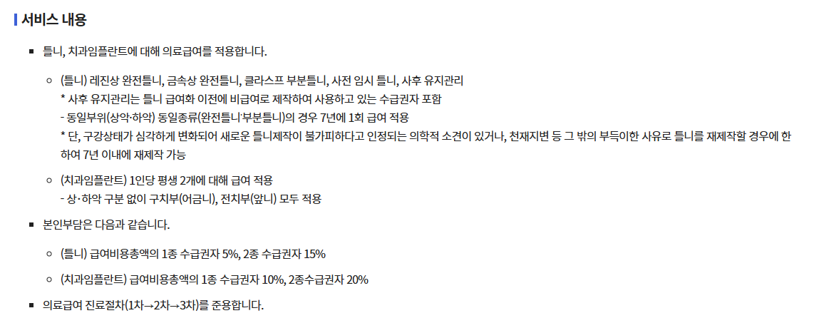 예를 들어, 전체 시술비가 100만 원이라면 1종 수급자는 10만 원, 2종 수급자는 20만 원을 본인이 부담하게 됩니다. 이는 일반 임플란트 시술이 수백만 원에 달하는 점을 고려했을 때 매우 큰 혜택입니다.
