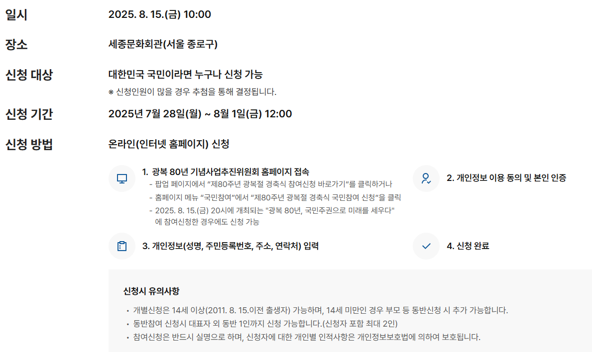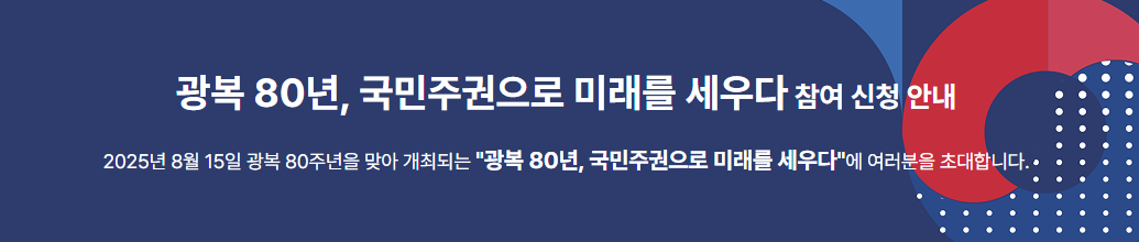 2025년 8월 15일, 우리 모두가 함께 주권의 가치를 되새기고 광복의 빛을 이어가는 시간으로 만들어보시기 바랍니다. 지금 바로 신청하시고, 역사적인 자리에 함께하세요.