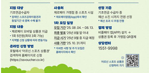 이번에 지원되는 '어르신 스포츠 상품권'은 기초연금을 받고 있는 만 65세 이상 어르신을 대상으로 1인당 최대 3매, 총 15만 원 상당의 스포츠 관련 상품권을 지원하는 사업입니다.