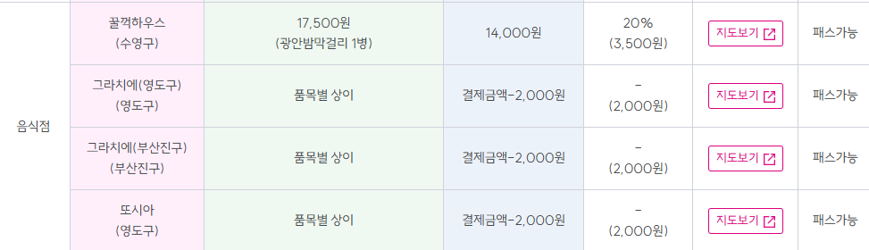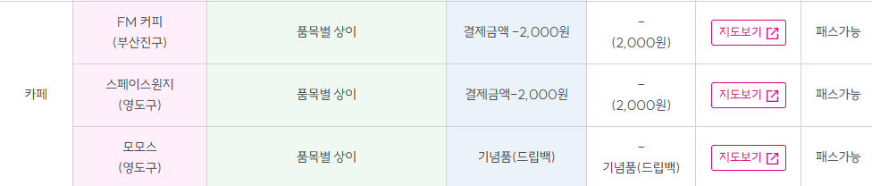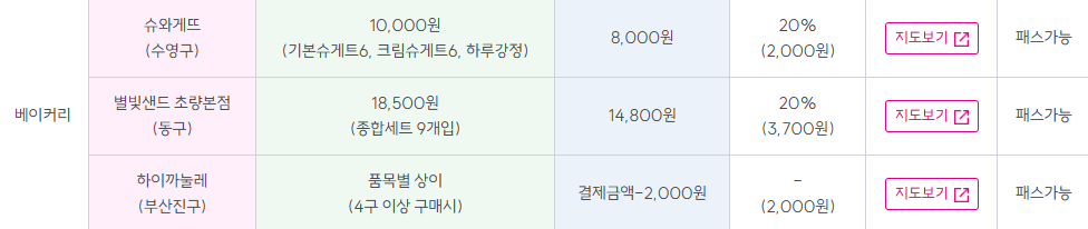카페/음식점/베이커리: 최대 2,000원 할인 또는 20% 내외 정률 할인