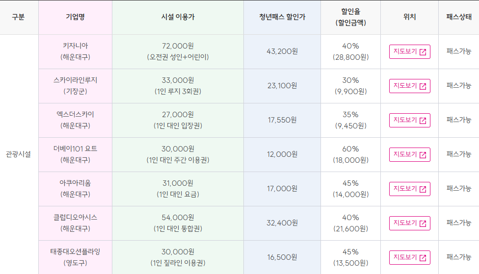 이 패스를 통해 청년들은 총 17곳에서 혜택을 누릴 수 있으며, 최대 할인금액은 무려 13만 6,450원에 달합니다. 그 안에는 키자니아, 더베이101 요트, SEA LIFE 부산아쿠아리움, 클럽디오아시스 등 인기 관광시설 7곳과 모모스커피(영도점) 등 음식점 및 카페 10곳이 포함되어 있습니다.