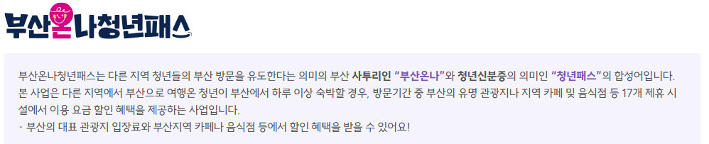 '부산온나청년패스'는 부산 외 지역에 거주하는 만 18세부터 39세까지의 청년(1985~2007년생)을 대상으로, 부산에 하루 이상 숙박 시 다양한 지역 관광지 및 식음업체에서 할인을 받을 수 있는 제도입니다.