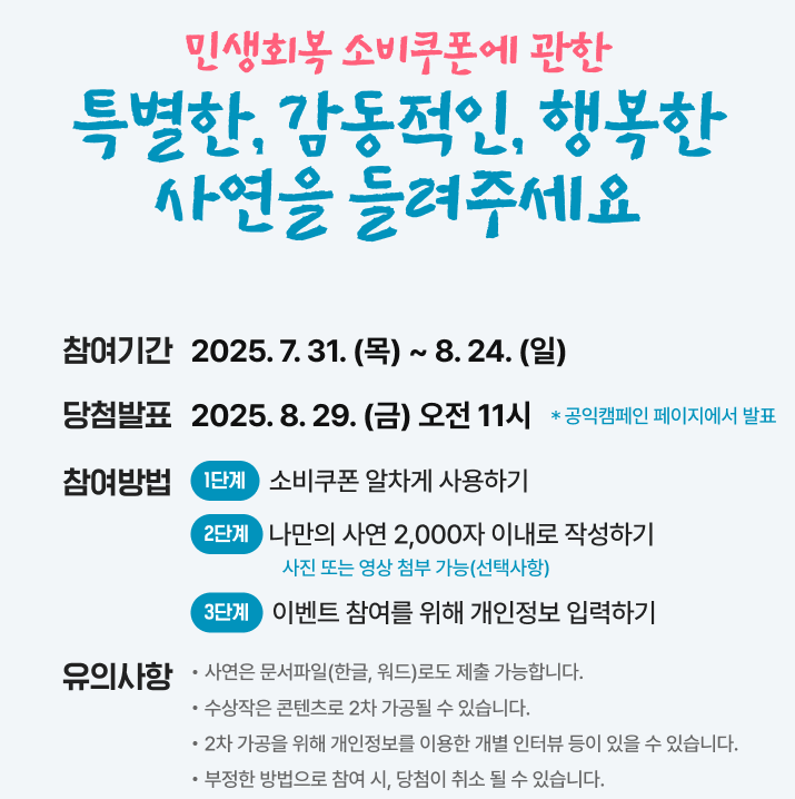 ‘민생회복 소비쿠폰 사연 공모전’은 일상 속 소비를 통해 지역 소상공인을 도운 따뜻한 경험을 나누고, 이를 통해 더 많은 사람에게 지역 소비의 가치를 알리고자 기획된 국민 참여형 캠페인입니다.